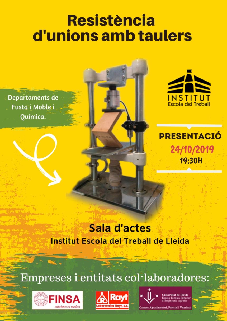 Presentació de la metodologia d’assaig per a unions amb taulers. Resultats obtinguts en la seva aplicació en l’assaig de tres tipus d’unions i dos tipus de cola. Activitat gratuïta, cal confirmar assistència a jsemis@escoladeltreball.cat